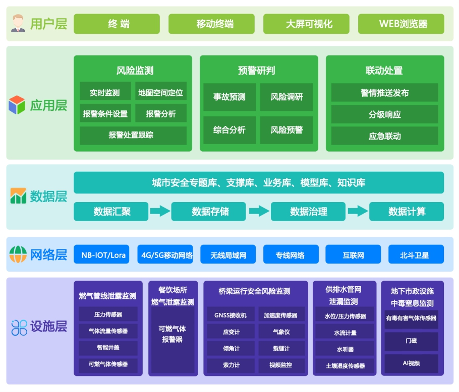 搭建城市安全感知网,部署智能感知设备于地下管网、桥梁、隧道等关键设施,实现城市生命线工程的全面感知、自动采集、监测分析、预警上报、及时处置。